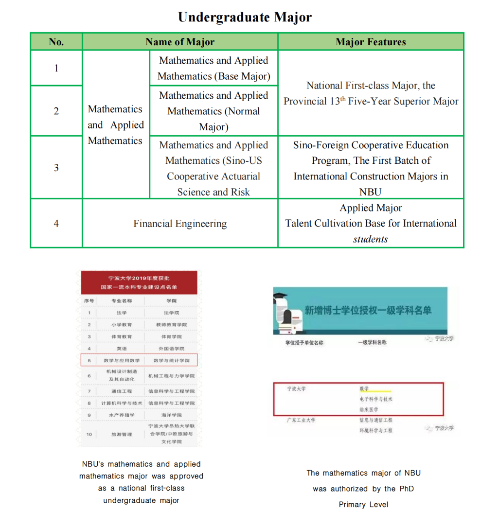 The school sets up  three  departments  of  Mathematics,  Applied  Mathematics  and  Statistics & Financial Engineering. It currently has four undergraduate majors: Mathematics and Applied Mathematics (Base Major), Mathematics and Applied Mathematics (Normal Major), Mathematics and Applied Mathematics (Sino-US Cooperative Actuarial Science and Risk Management), and Financial Engineering. Mathematics and  Applied Mathematics was awarded  as the National First-class Major, the Provincial 13th Five-Year Superior Major,  Ningbo  Municipal Brand Major (Level A), the first batch of international construction majors and the first-class professional construction projects in NBU. The school now has first-level doctoral and master programs in mathematics. Mathematics was awarded as the Provincial 12th Five-Year Key Discipline, Ningbo Municipal Key Discipline (Level A) and in the fourth group of Key Discipline of Ningbo’s universities.