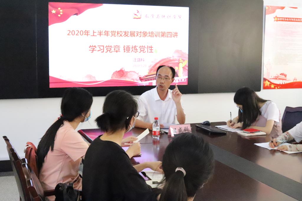 5月20日下午,我院2020年分党校发展对象培训班第五讲在学院116会议室举行。资产与实验室管理处处长汪盛科为学员们带来主题为“学习党章、锤炼党性”的党课。