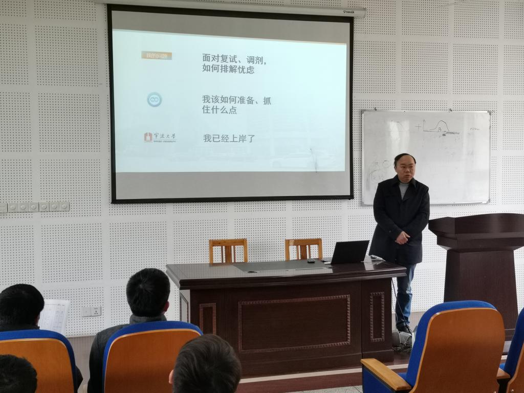 会议伊始,徐松老师向同学们详细地讲述了考研复试准备的各个步骤和需要注意的问题。紧接着,胡良根老师则从考生自身、学院和学校三个方面为学生分享其帮助往届学生考研复试和调剂成功的经验。随后,俞金波书记鼓励同学们要做好充分的准备,积极抓住一切可能的机会,以便能够继续深造。