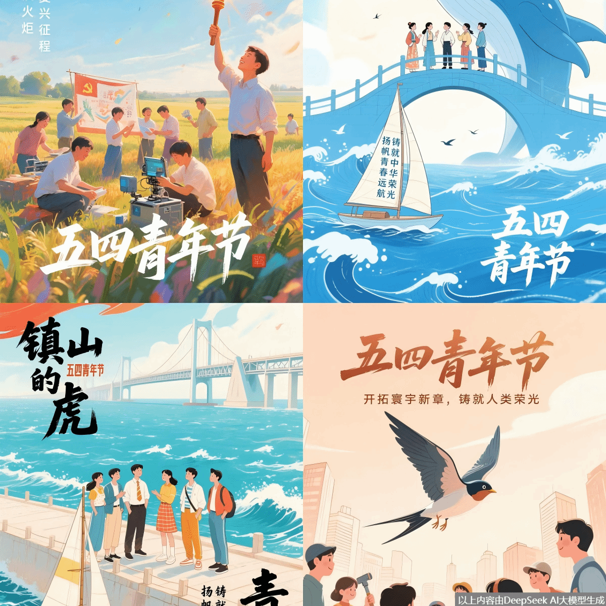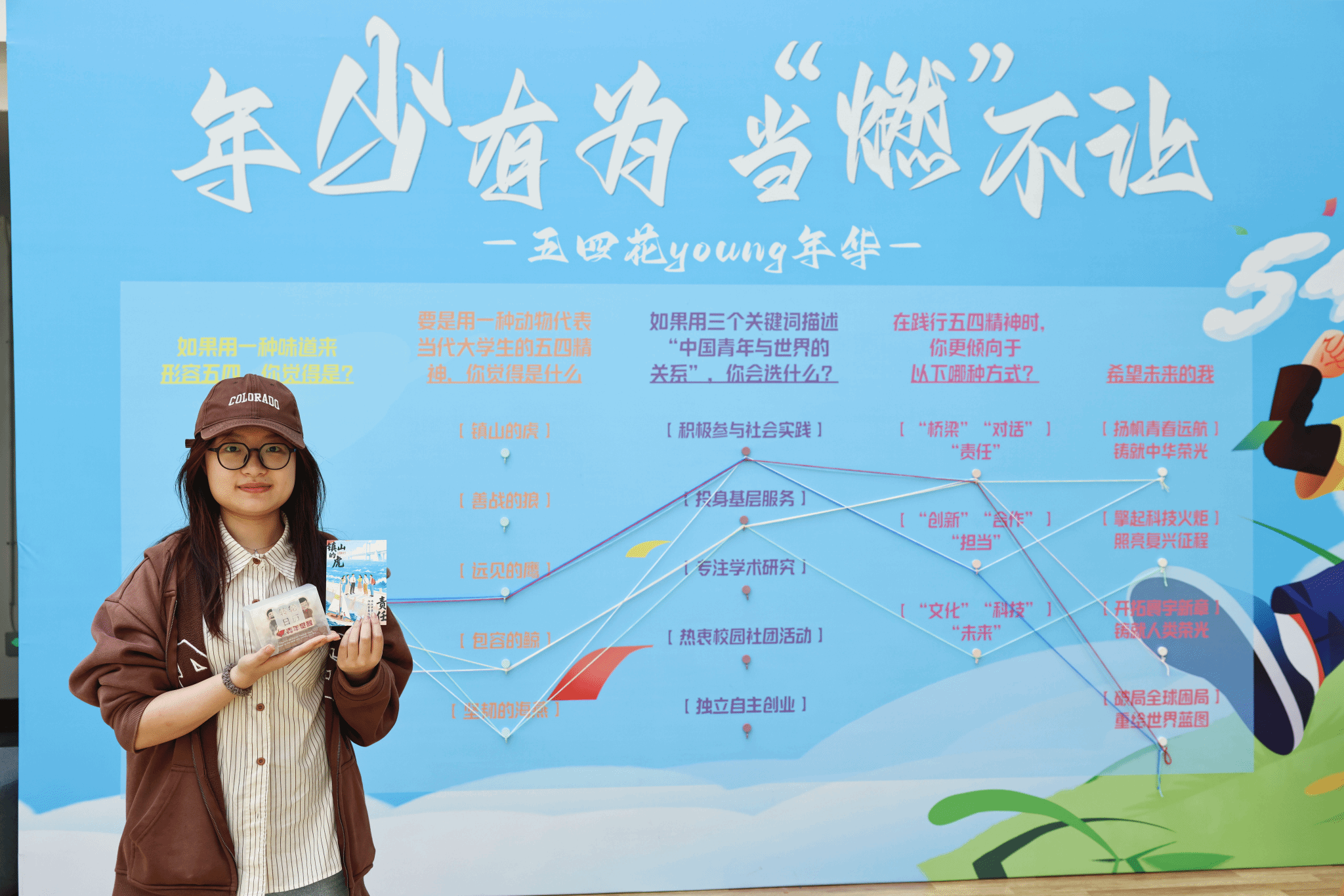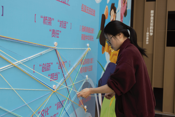 在“绕线之韵”的创意互动环节中,青年学子以彩色织线为媒介,在主题墙上编织出对五四精神的独特诠释。从“用味道描绘五四精神”的酸甜苦辣,到“用三个关键词定义中国青年与世界”的深刻思考,同学们将抽象理念转化为具象创作,勾勒爱国的赤子之心。活动现场还创新引入AI视觉生成技术,当DeepSeek大模型识别主题墙上的创意关键词后,实时生成融合青年特征的数字艺术底片。这场传统手工艺与智能科技的跨界对话,让“民主”“科学”的五四精神在数字时代焕发新生机。