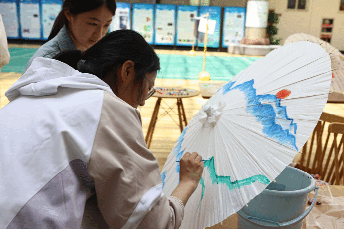 在“青伞丹心”环节,同学们在特制的油纸伞上尽情挥洒创意:水彩粉墨交织,将心中的山川湖海栩栩如生地呈现在伞面,每一笔都洋溢着深情厚意。有的伞面上描绘了五岳的崇山峻岭,有的则刻画了江南的烟雨古镇,这些作品不仅展现了同学们的艺术才华,更是他们对祖国山河的深切热爱与由衷赞美。