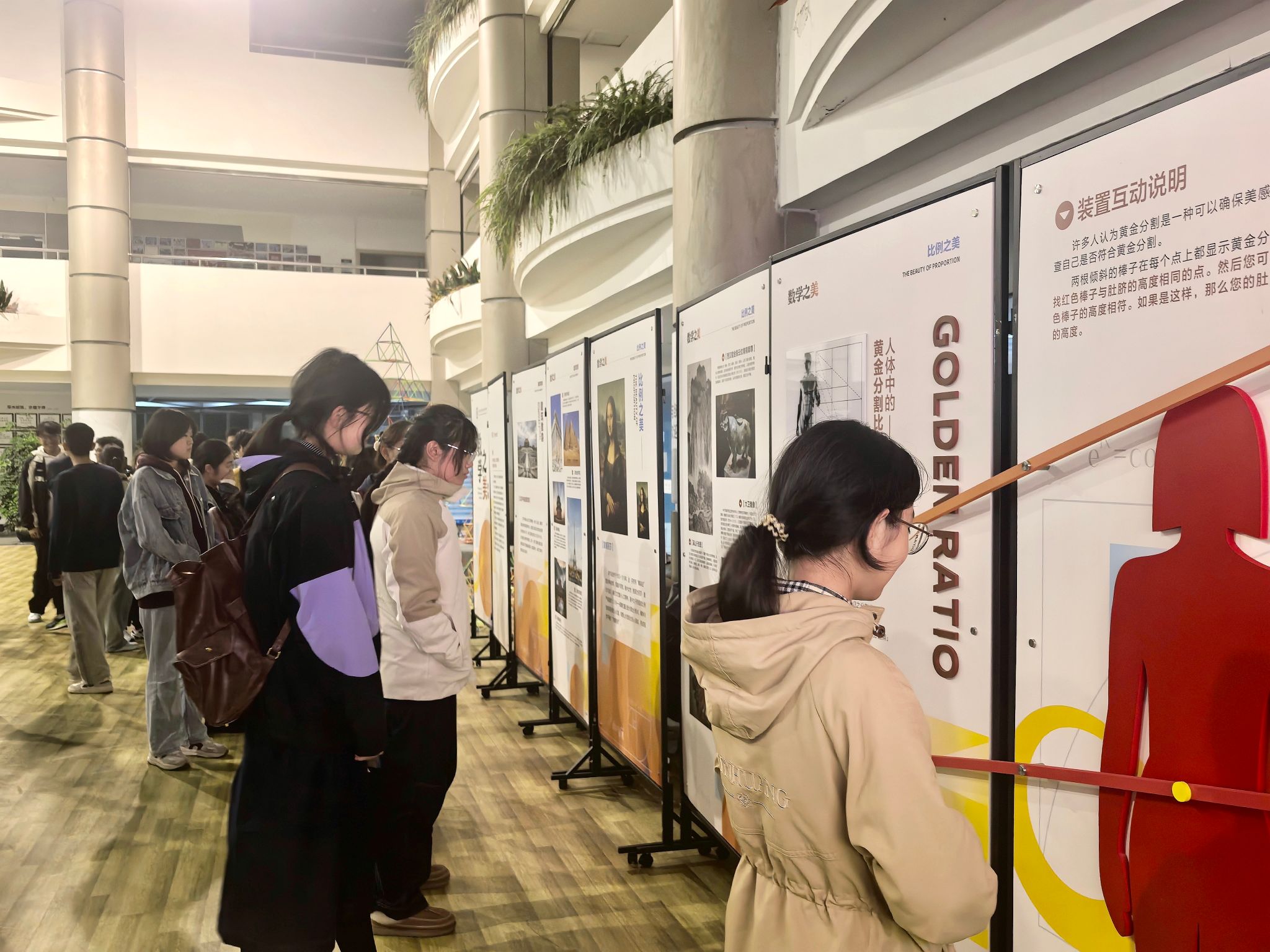 精心策划的“数学之美特展”精彩亮相。展览以“以数启美,以文化人”为主题,通过图文展板、实物模型与互动游戏相结合的形式,将抽象的数学知识转化为直观的美学体验,吸引了校内外师生、校友及市民驻足参观,成为建校纪念周系列活动的一大亮点。