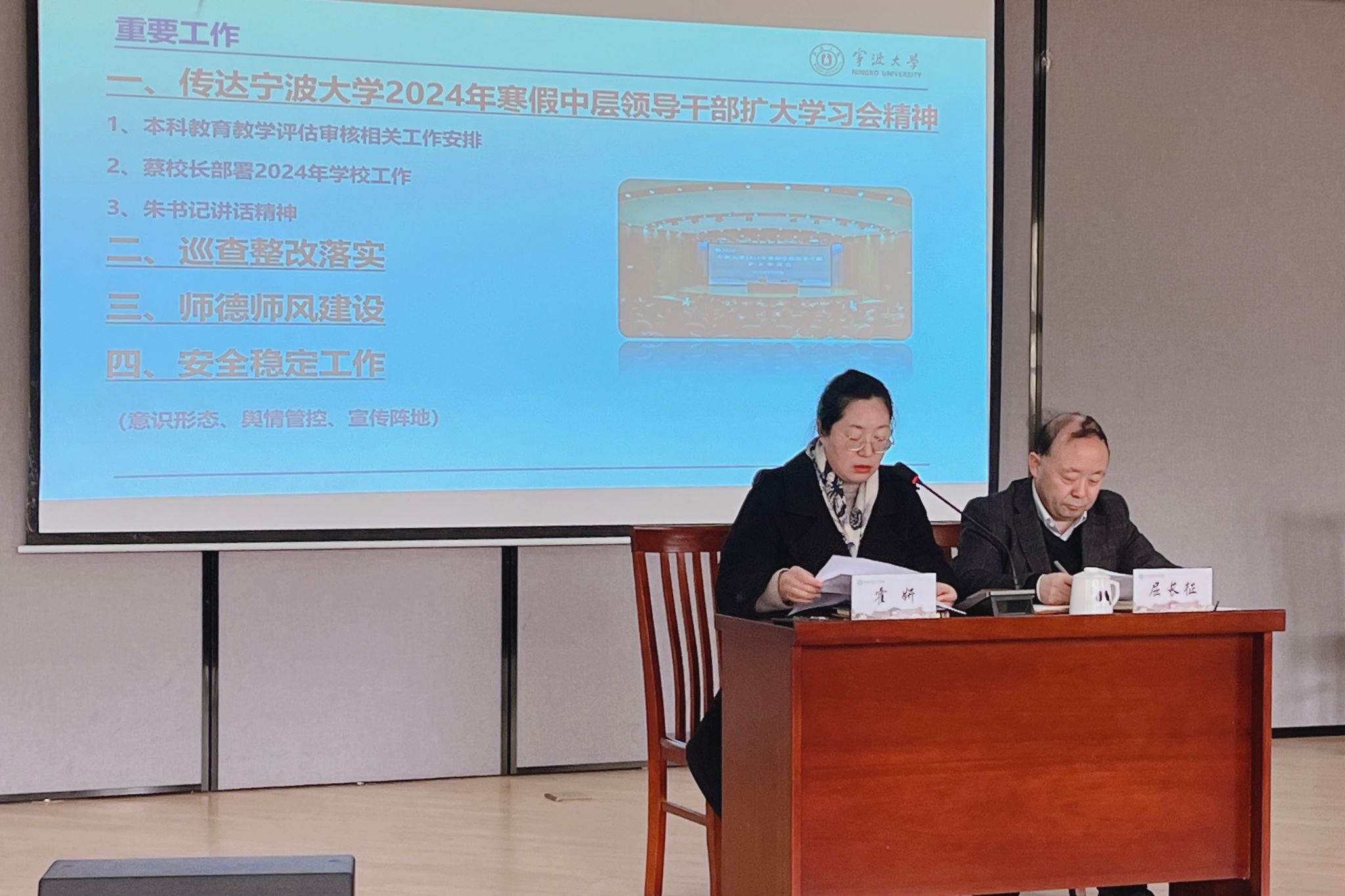 Huo Yan conveyed the relevant spirits of Ningbo University's 2024 Winter Enlarged Session. She shared theme report on "to be struggling, practical, and excellent" of NBU Party Secretary Zhu Da and emphasized his three opinions on the overall work of the university. She also conveyed President Cai Ronggen's nine main work arrangements for 2024 and Vice President Lv Chaofeng's emphasis on the time node and disciplinary requirements of undergraduate education and teaching review and evaluation. In terms of the deployment of key work in the school, Huo Yan pointed out that welcoming undergraduate education and teaching evaluation is also one of the most important tasks of the school this semester, which requires the participation of all staff, active preparation, and serious reception of evaluations. At the same time, she emphasized other key work that the school needs to promote in combination with inspections and rectification. She required that the "three teams" of the school should closely focus on the key and difficult points of work, focus on cohesion, and truly work hard. In addition, Huo Yan also deployed the construction of professional ethics and conduct, as well as safety and stability work.