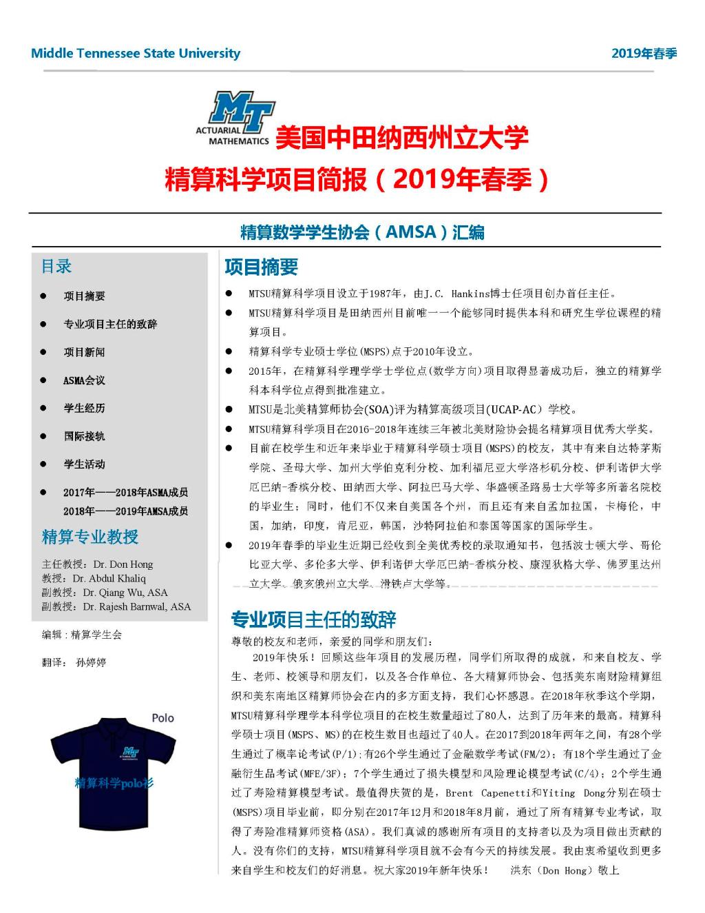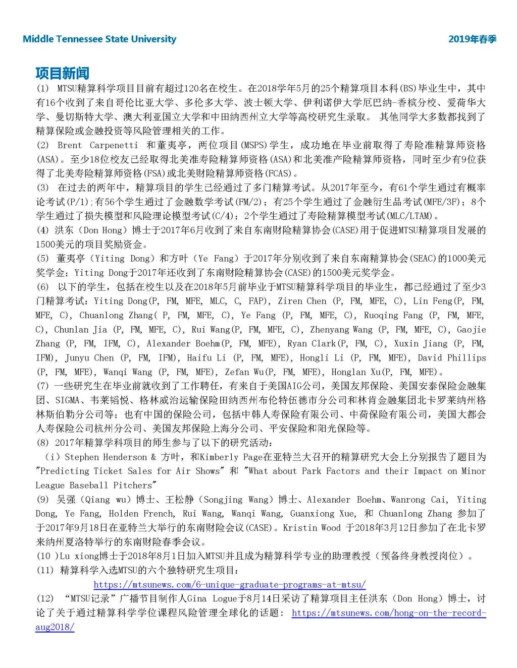 MTSU精算专业2019春季项目简报